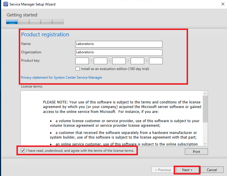 Insira as informações referentes ao licenciamento do produto, aceite os termos do contrato e prossiga para próxima etapa