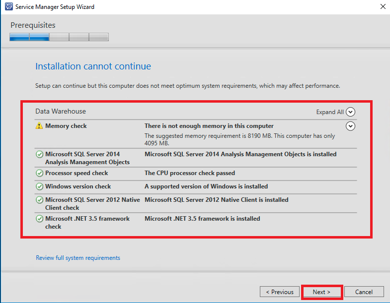 O assistente de instalação irá checar se o servidor atende e possuí todos os pré requisitos para instalação. Após a conclusão do processo, avance para próxima etapa