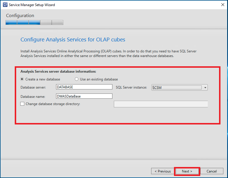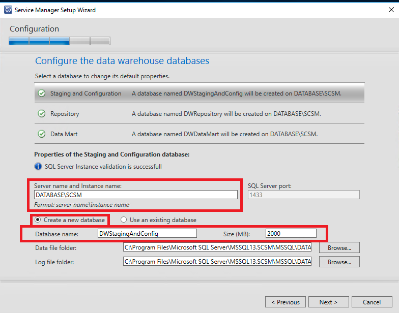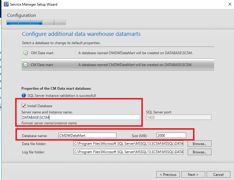 Selecione o nome e a instância do servidor SQL (no nosso caso será o DATABASE/SCSM)