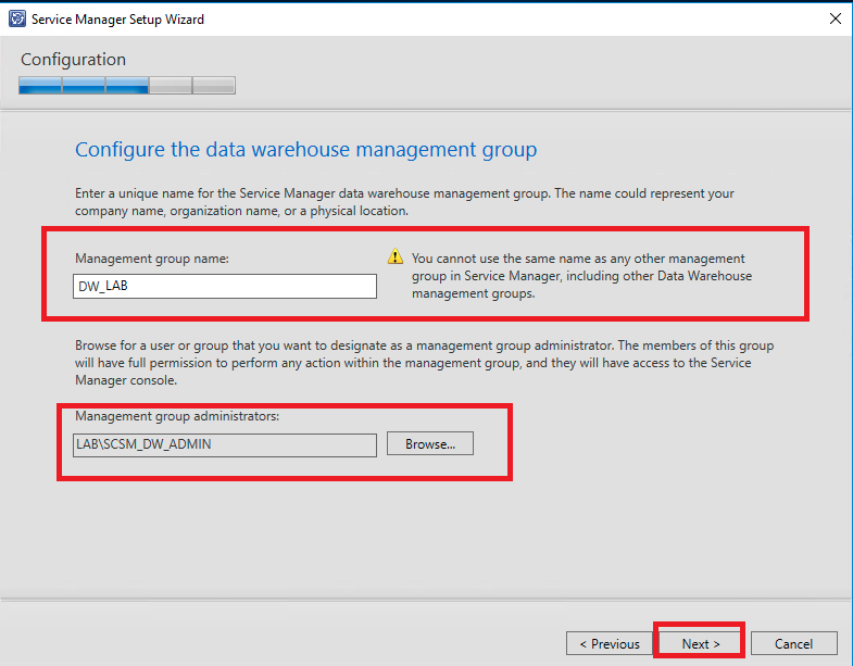 Insira um nome para o grupo de gerenciamento do DW
