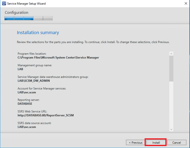 Na tela de sumário será possível avaliar todas as configurações definidas anteriormente, selecione a opção "Install" para que o DW seja instalado no servidor SQL