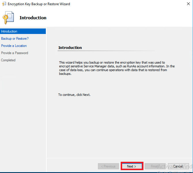 Na tela de introdução do assistente de Backup, selecione a opção "Next"