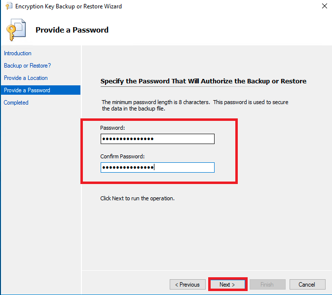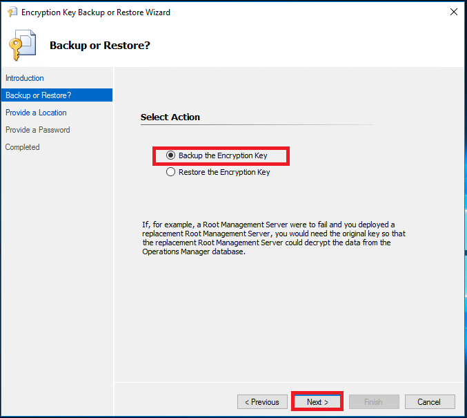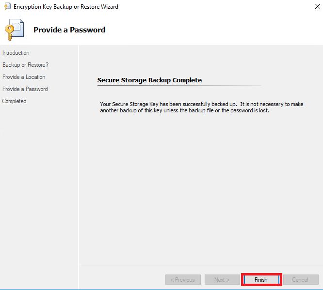 Selecione a opção "Backup the Encryption Key" e prossiga