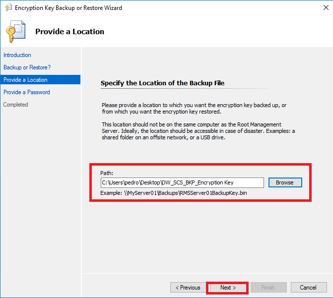 É importante que após o backup da chave de recuperação, o arquivo seja armazenado em um local seguro, com rotinas de backup