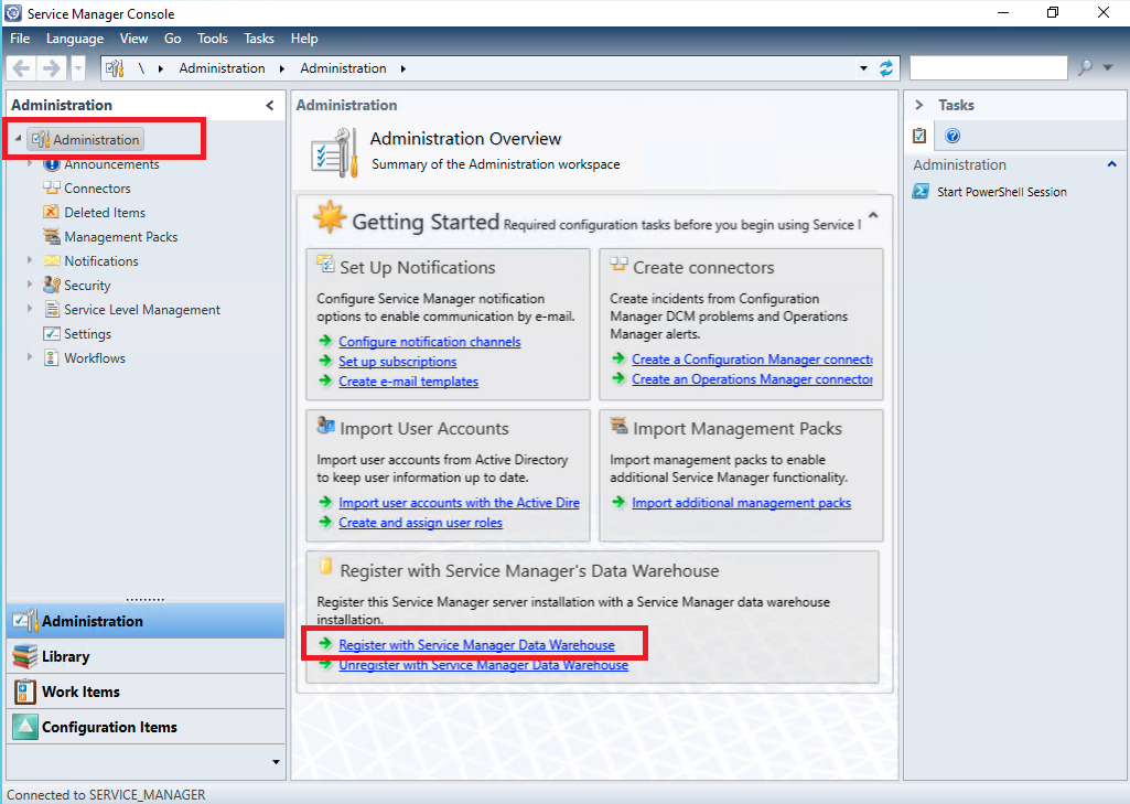 No menu "Administration" selecione a opção "Register with Service Manager Data Warehouse"