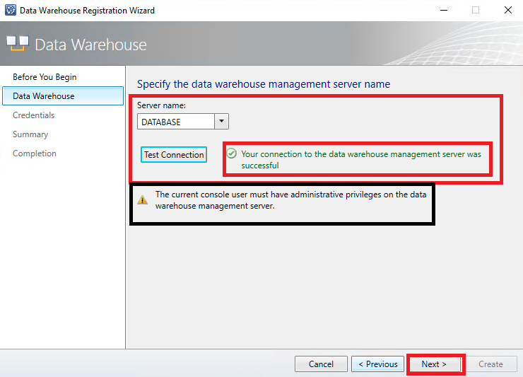 Insira o hostname do servidor de banco de dados que possuí o serviço de DW instalado e selecione a opção "Test Connection". Após o teste ser realizado com sucesso, selecione a opção "Next"