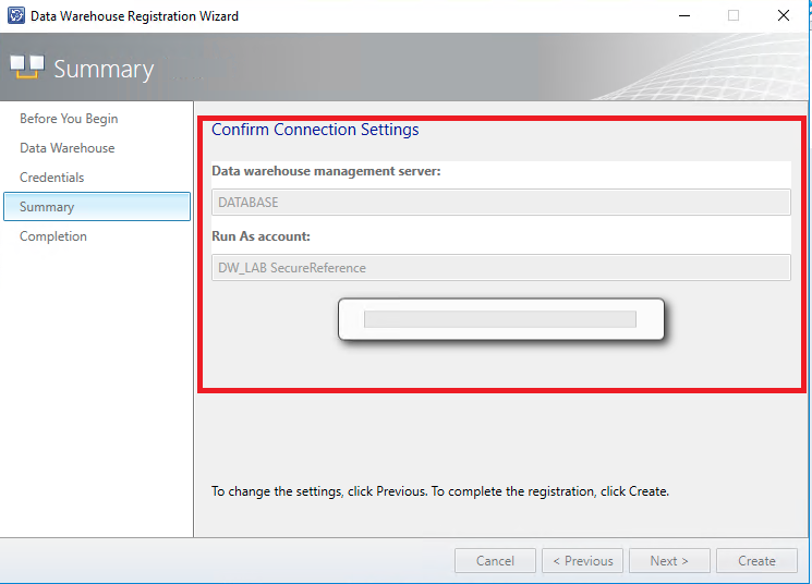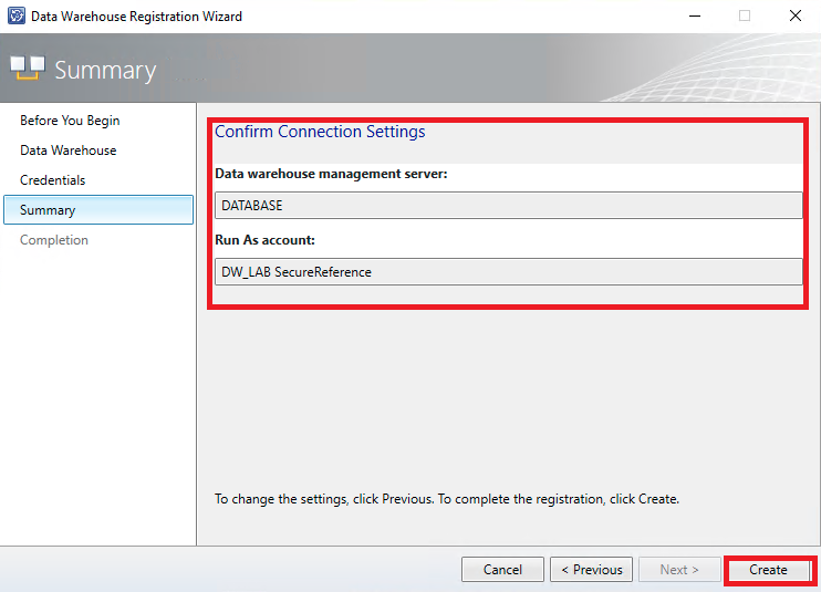 Na tela de sumário é possível verificar as configurações definidas nas etapas anteriores. Selecione a opção "Create" para iniciar o processo de registro do DW
