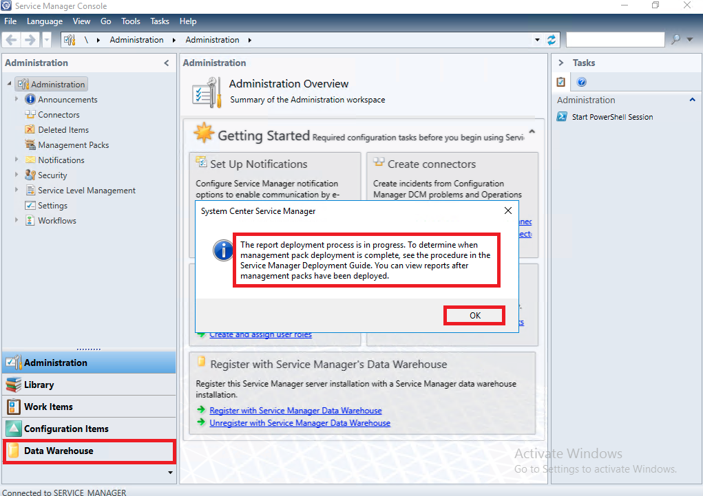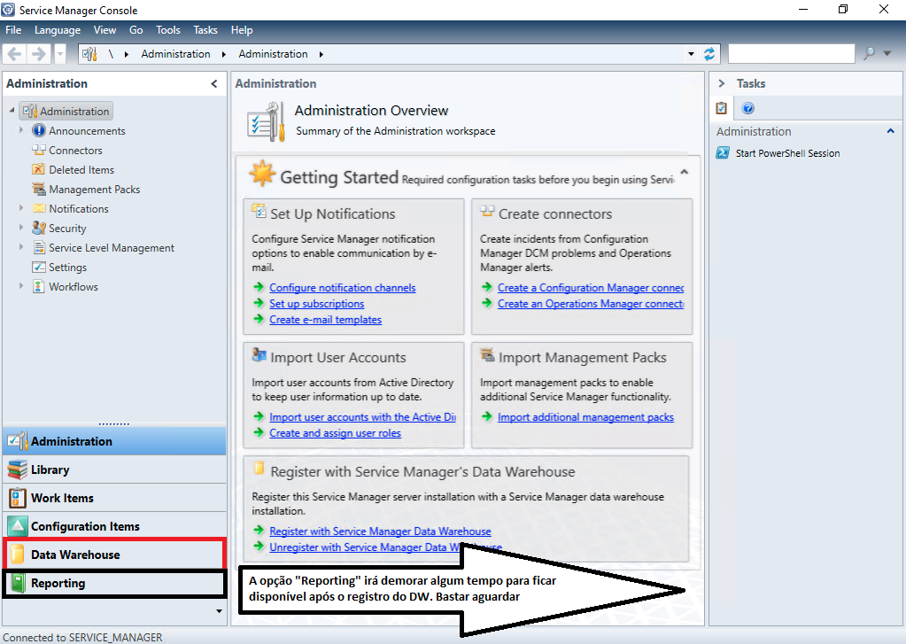 No console de gerenciamento do Service Manager já será possível notar a presença do serviço de Datawarehouse